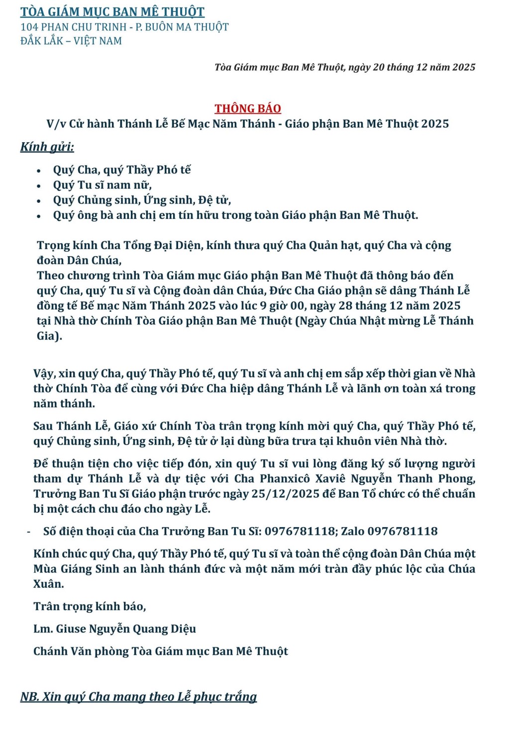 Tòa Giám mục Ban Mê Thuột, ngày 20 tháng 12 năm 2025