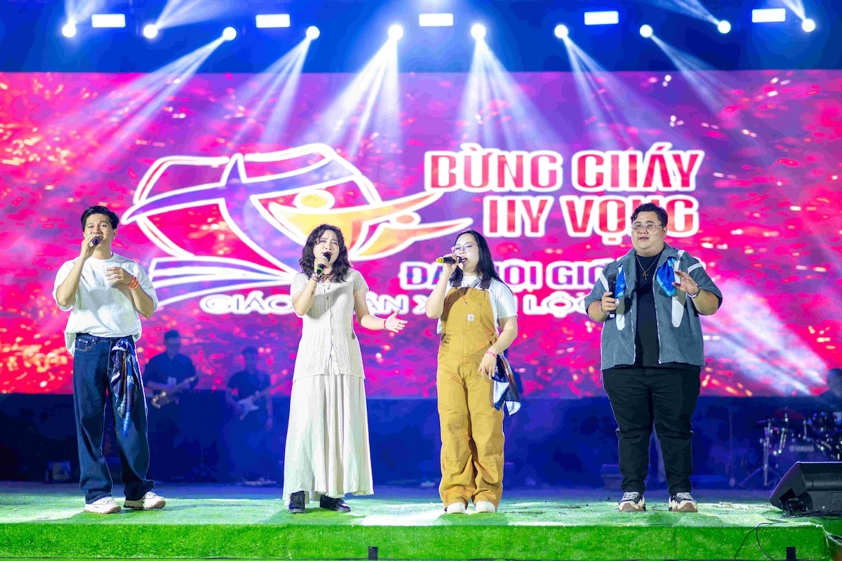 Sau khi được Chúa Giêsu Thánh Thể đổ đầy ân sủng, bầu khí Đại hội đẩy lên cao trào lúc 18g45 qua chương trình Thánh ca – Bừng Cháy Hy Vọng. Hàng ngàn trái tim cùng hòa chung nhịp đập, cất cao thánh ca chủ đề. Âm nhạc tại nơi đây không chỉ là sự giải trí, mà là lời tuyên xưng mạnh mẽ và nhiệt huyết nhất của một thế hệ trẻ quyết tâm sống đức tin một cách mãnh liệt.