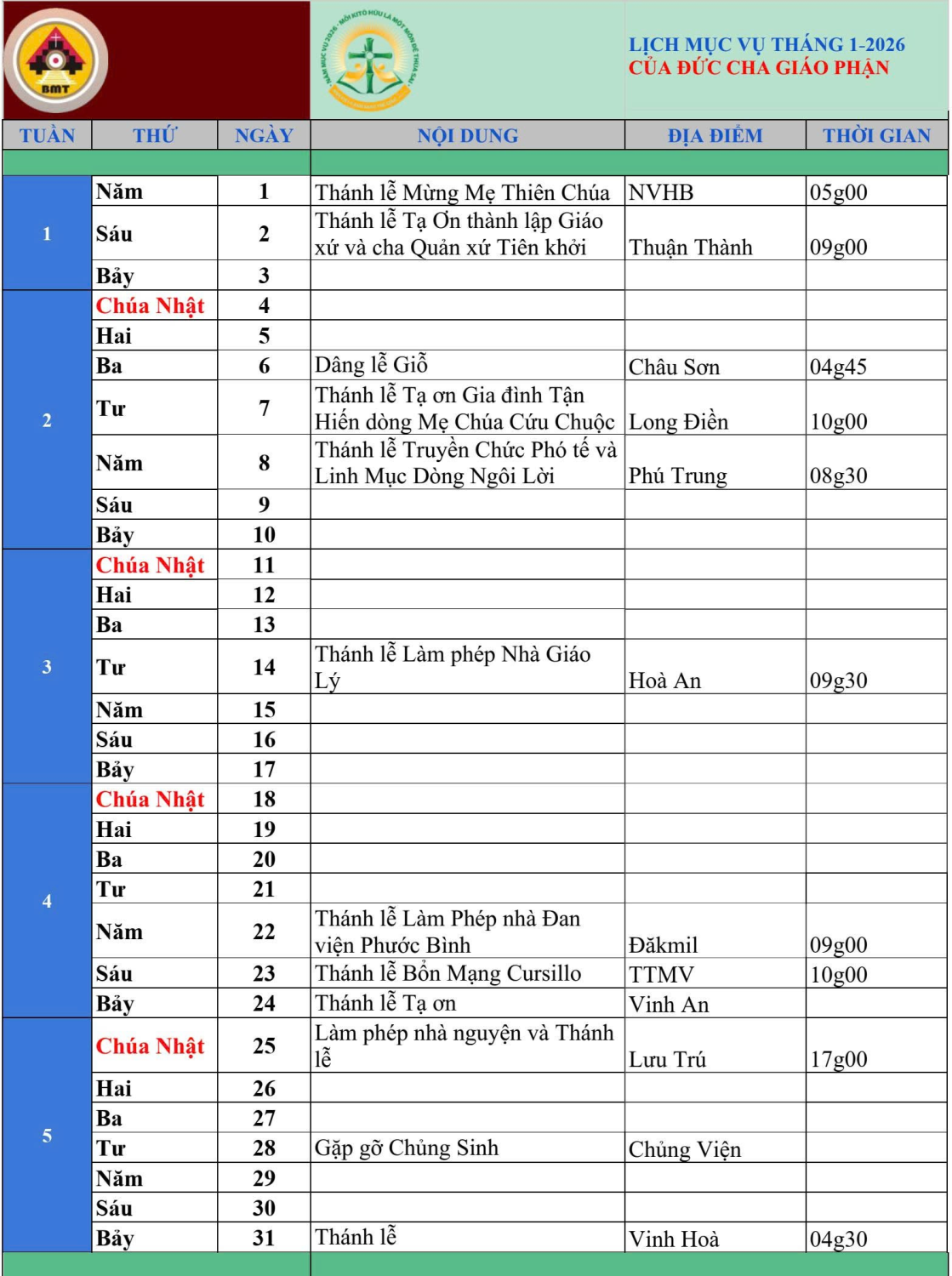Lịch mục vụ tháng 01.2026 của Đức Giám Mục