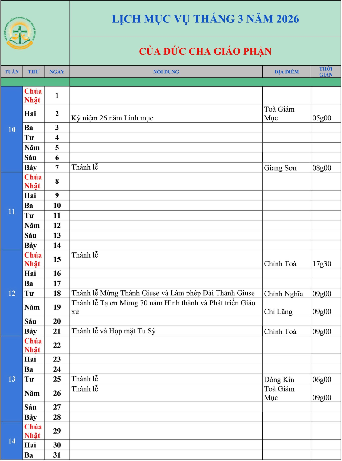 Lịch mục vụ tháng 03.2026 của Đức Giám Mục