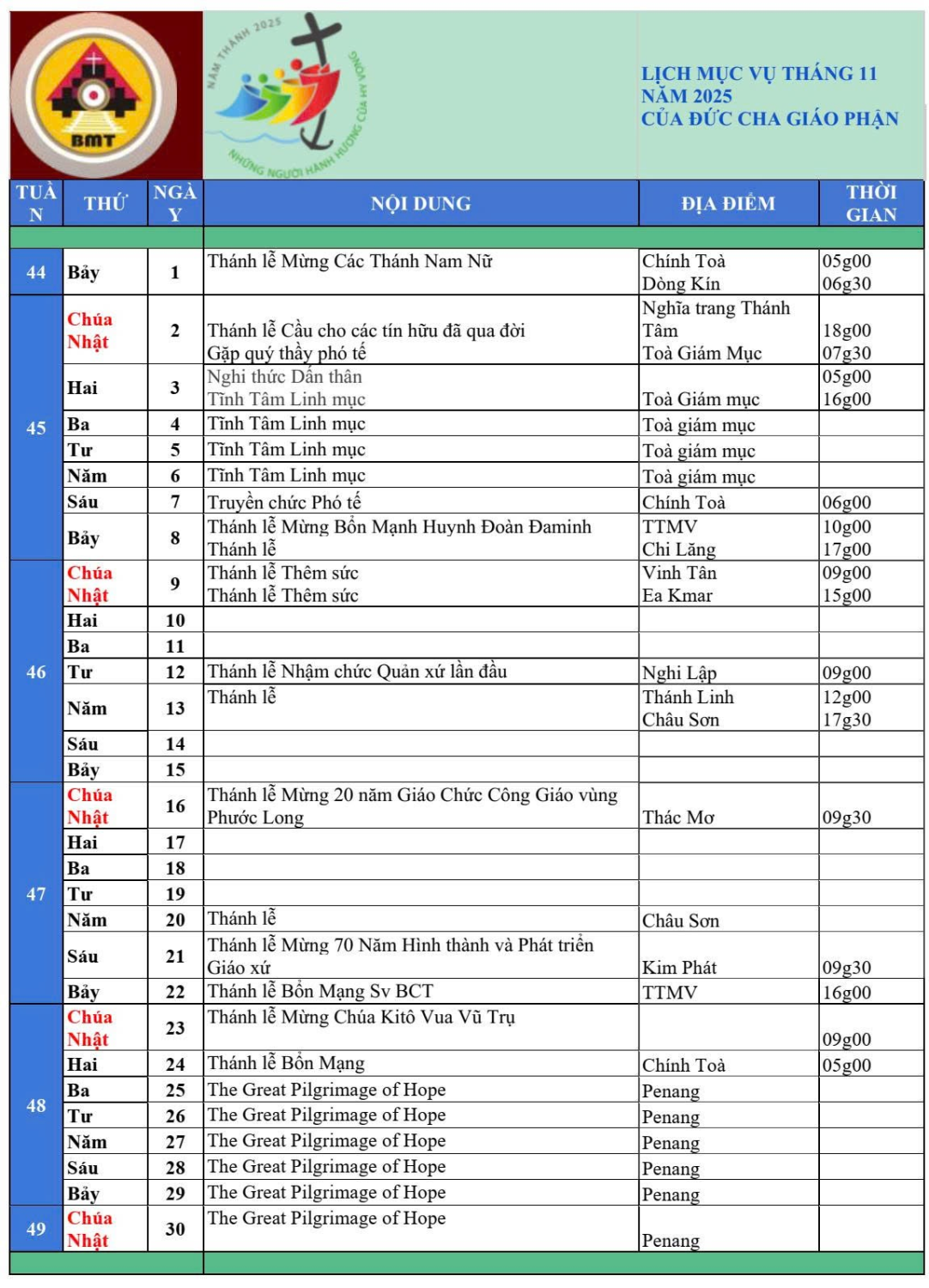 Lịch mục vụ tháng 11.2025 của Đức Giám Mục