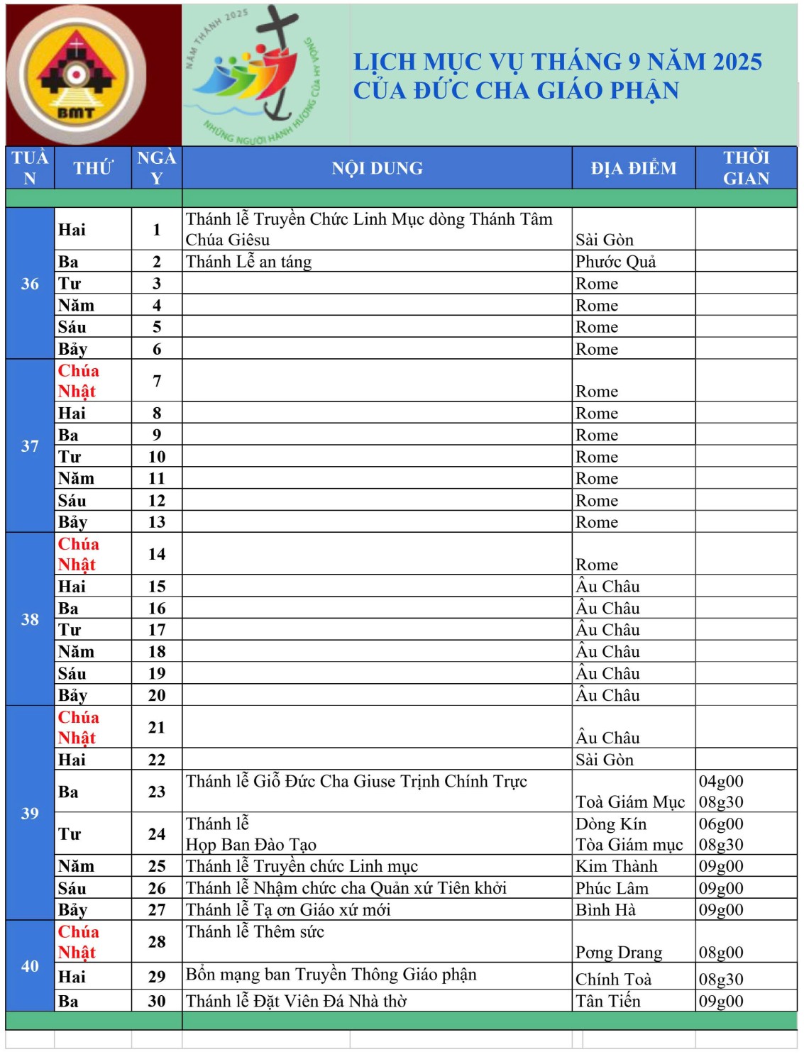 LỊCH MỤC VỤ THÁNG 09 NĂM 2025