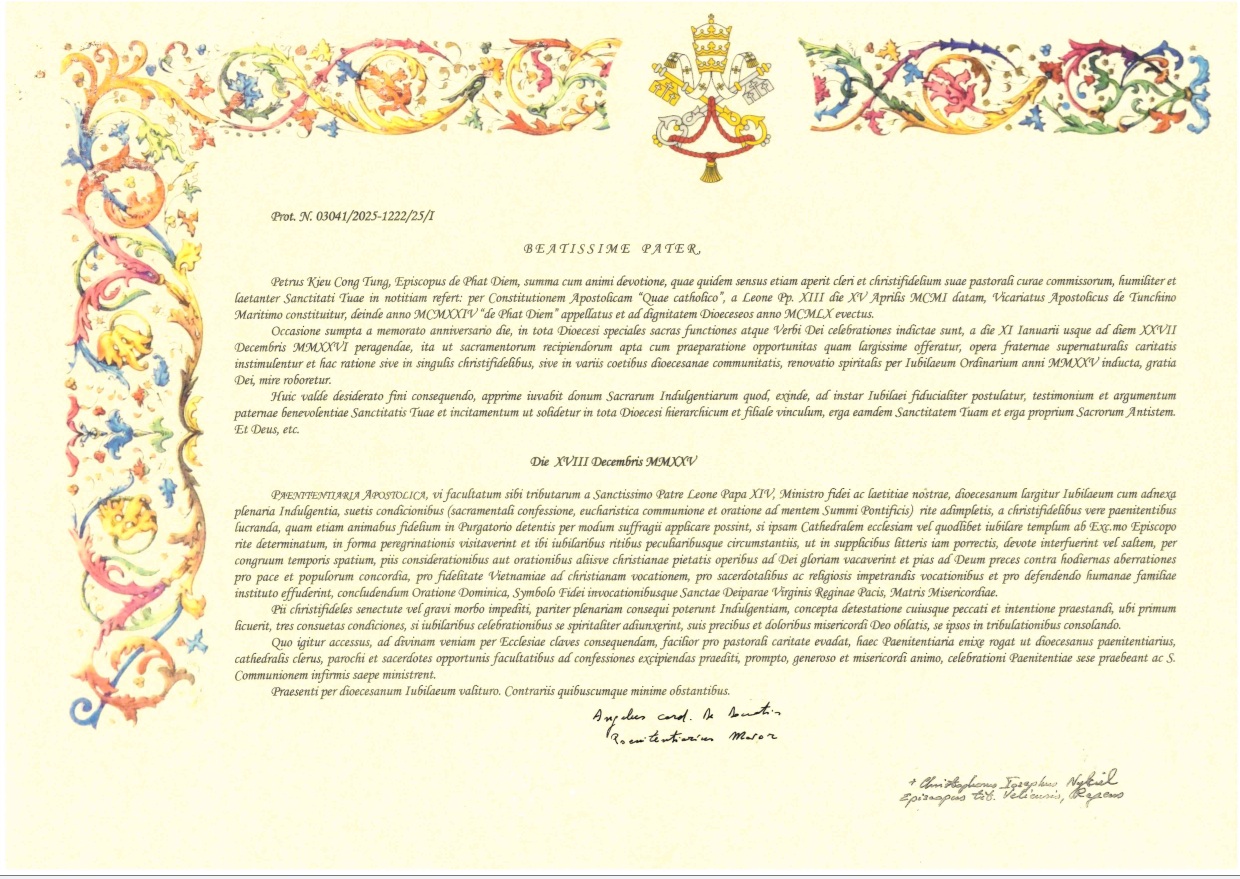 Tòa Ân Giải Tối Cao, nhờ năng quyền được ban từ Đức Thánh Cha Lêô XIV, vị Mục tử của đức tin và niềm vui nơi chúng ta, quảng đại ban Năm Thánh Giáo phận cùng với Ơn Toàn Xá, theo các điều kiện thông thường (xưng tội, rước lễ và cầu nguyện theo ý Đức Giáo Hoàng), cho tất cả các tín hữu thật lòng thống hối, khi hành hương và sốt sắng tham dự Thánh lễ tại Nhà thờ Chính tòa hoặc tại bất kỳ Nhà thờ hay Nhà nguyện nào được Đức Giám mục chỉ định, vào những ngày đã được ấn định; hoặc ít là, khi dành một khoảng thời gian thích hợp tại đó để suy niệm, cầu nguyện hay làm các việc đạo đức Kitô giáo, nhằm vinh danh Chúa, và sốt sắng dâng lên Thiên Chúa lời khẩn cầu cho khỏi các lầm lạc của thời đại, cho hòa bình và sự hòa hợp giữa các dân tộc, cho sự trung thành với ơn gọi Kitô giáo tại Việt Nam, cho ơn gọi linh mục và tu sĩ, cho việc bảo vệ thể chế gia đình nhân loại, kết thúc bằng Kinh Lạy Cha, Kinh Tin Kính và lời kêu cầu Đức Trinh Nữ Maria, Nữ Vương Việt Nam, Mẹ của Lòng Thương Xót. Ân Xá có thể được nhường lại cho linh hồn các tín hữu còn đang ở trong Luyện ngục.