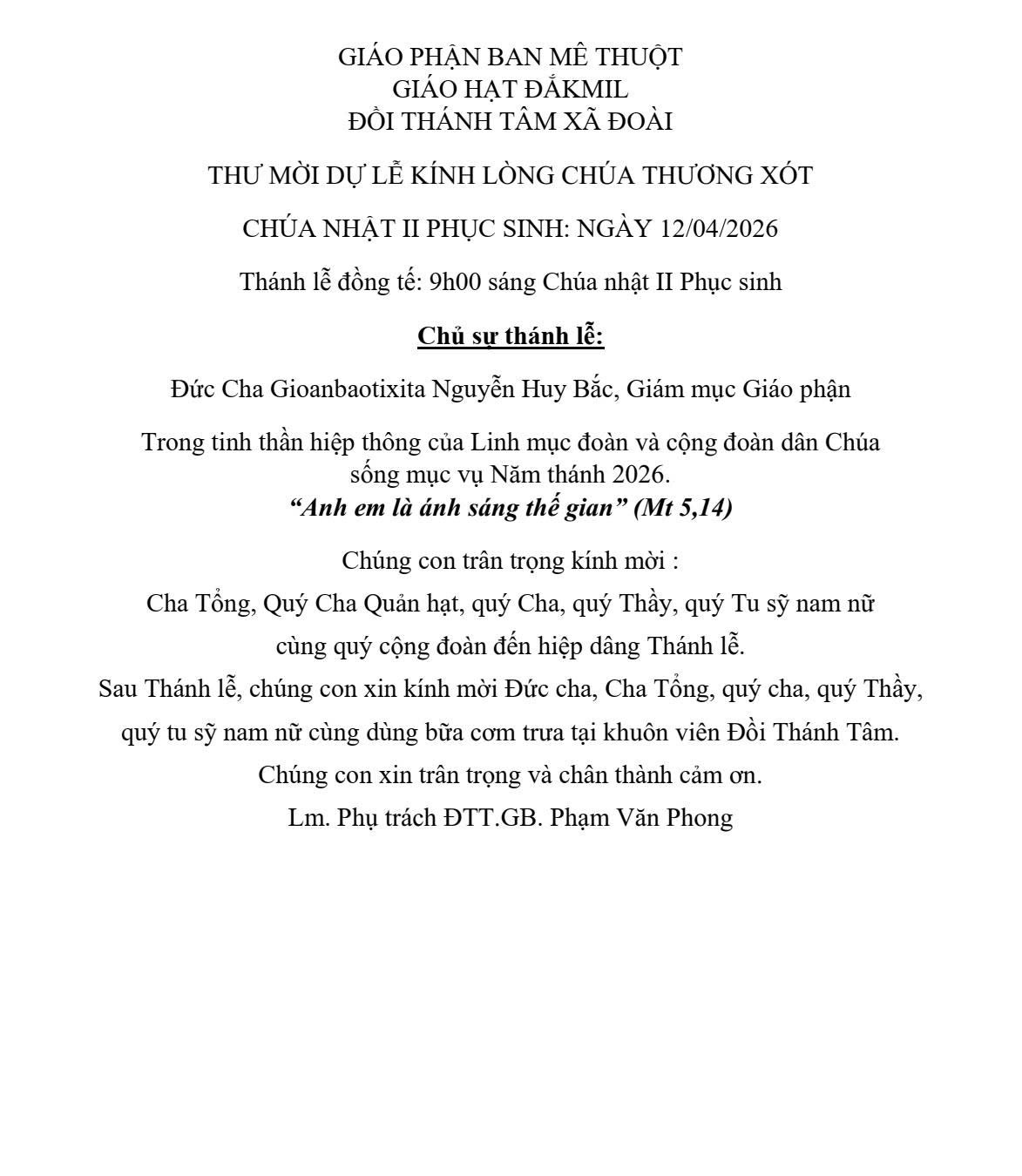 Sau Thánh lễ, chúng con xin kính mời Đức cha, Cha Tổng, quý Cha, quý Thầy, quý Tu sỹ nam nữ cùng dùng bữa cơm trưa tại khuôn viên Đồi Thánh Tâm.