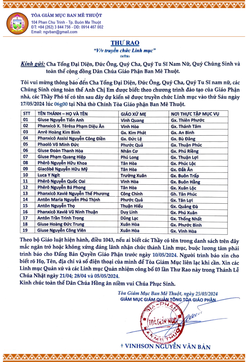 | 11 | Phêrô Nguyễn Quốc Oai | Vinh Hòa | Gx. Buôn Hằng |