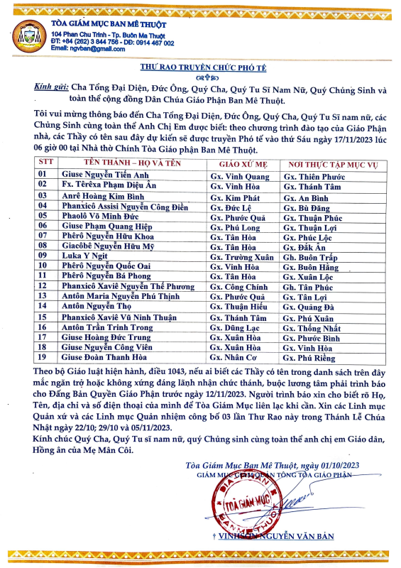Tôi vui mừng thông báo đến Cha Tổng Đại Diện, Đức Ông, Quý Cha, Quý Tu Sĩ nam nữ, các Chủng Sinh cùng toàn thể Anh Chị Em được biết: theo chương trình đào tạo của Giáo Phận nhà, các Thầy có tên sau đây dự kiến sẽ được truyền chức Phó Tế vào thứ Sáu ngày 17/11/2023 lúc 06 giờ 00 tại Nhà thờ Chính Tòa Giáo phận Ban Mê Thuột.