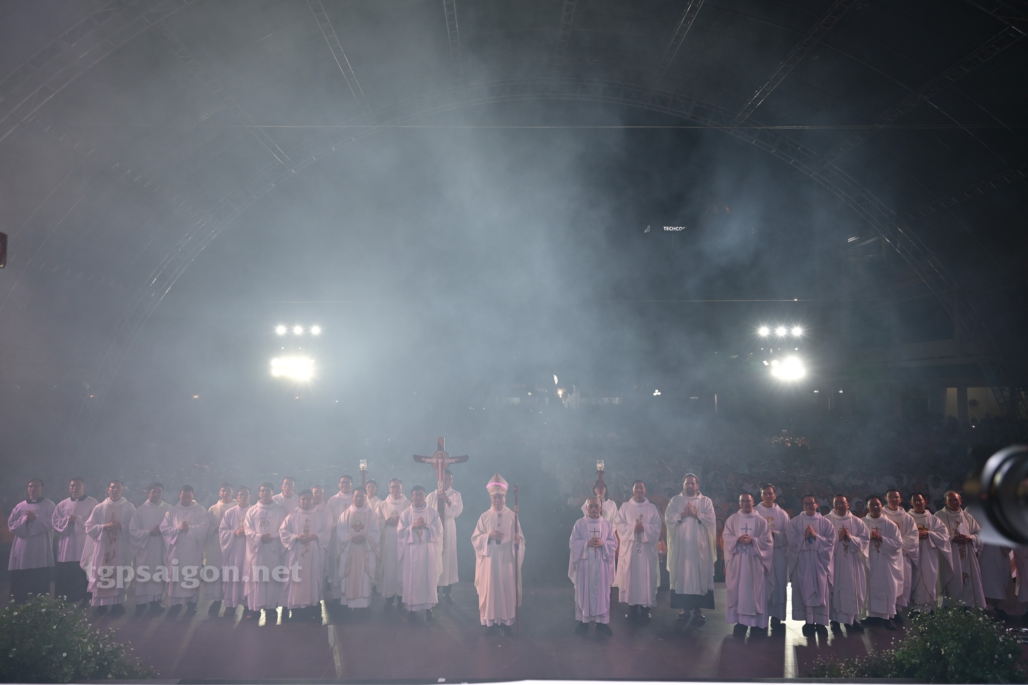 Lúc 17g30, Thánh lễ đỉnh cao của Đại hội. Đoàn đồng tế được rước từ nhà khách của TTMV, tiến lên lễ đài.