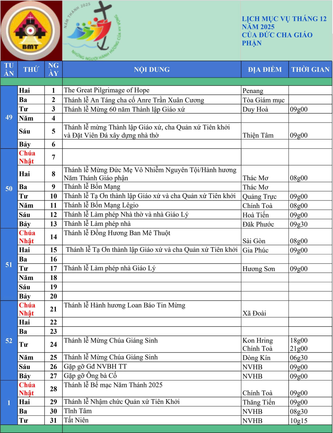 Chủ Nhật (14/12): Thánh lễ Đồng hương Ban Mê Thuột – Sài Gòn (08g00)