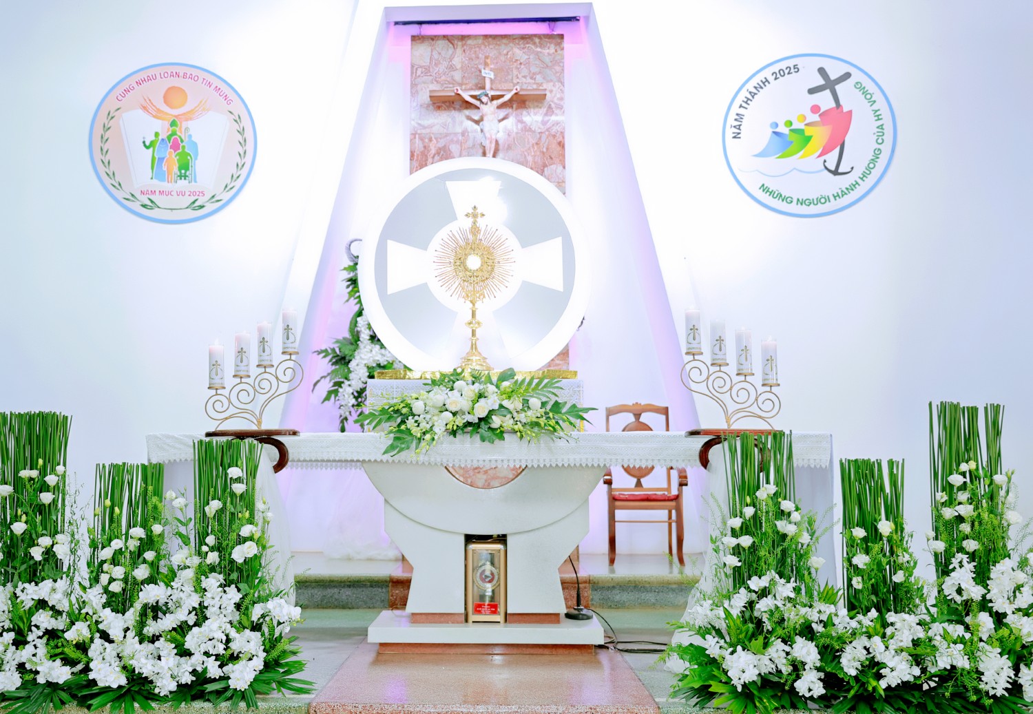 Được gợi hứng từ thư chung của HĐGM VN năm 2025, Cha quản xứ đã chọn cho chủ đề ngày Chầu lượt : “Thánh Thể, nguồn sống của môn đệ thừa sai – Anh em là ánh sáng thế gian”. Ngày Chầu Lượt năm nay mời gọi các tín hữu chiêm ngắm Thánh Thể như trung tâm của đời sống Giáo Hội và là nguyên lý linh hoạt mọi hoạt động mục vụ – truyền giáo. Chính Thánh Thể làm nảy sinh đức tin, nuôi dưỡng niềm cậy trông và thắp sáng ngọn lửa bác ái, để người môn đệ Chúa trở nên ánh sáng giữa lòng thế giới tối tăm.