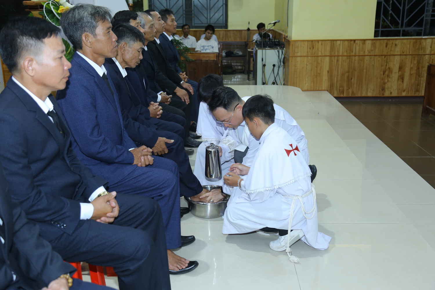 Cụ thể hóa ý nghĩa những việc Chúa Giê-su đã làm trong Bữa Tiệc Ly, cộng đoàn bước vào nghi thức Rửa chân. Noi gương Chúa Giê-su, cha chủ tế cũng cởi áo choàng mà thắt lưng, cúi mình rửa chân cho 12 vị vào vai các Tông đồ năm xưa. Đó là 5 vị trong Ban hành giáo 2 Giáo họ, các vị đại diện 5 giáo khu và 2 vị Ban hành giáo họ nhiệm kỳ trước.
