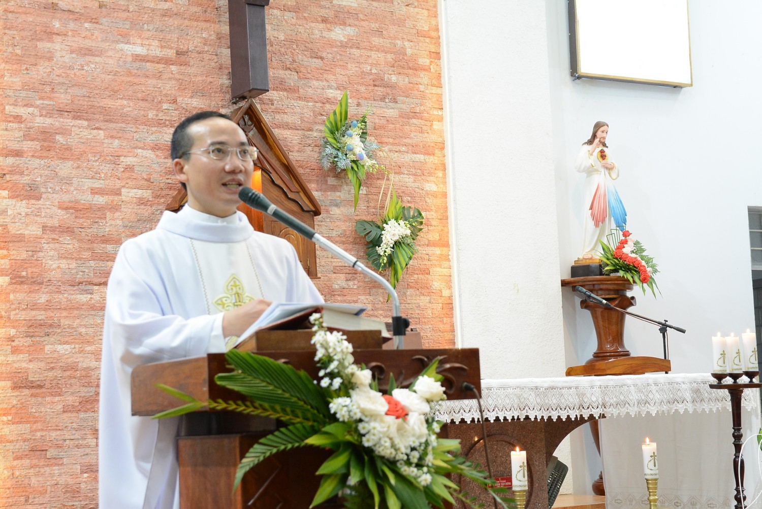 Bước vào Thánh lễ kết thúc tháng Mân Côi, Cha Phêrô mời gọi cộng đoàn dâng lên Chúa những lời chuyển cầu của Mẹ Maria, đặc biệt cầu cho mọi gia đình trong giáo xứ được hiệp nhất, yêu thương nhau, và cho thiếu nhi, giới trẻ siêng năng tham dự Thánh lễ, hăng say bước theo Chúa.