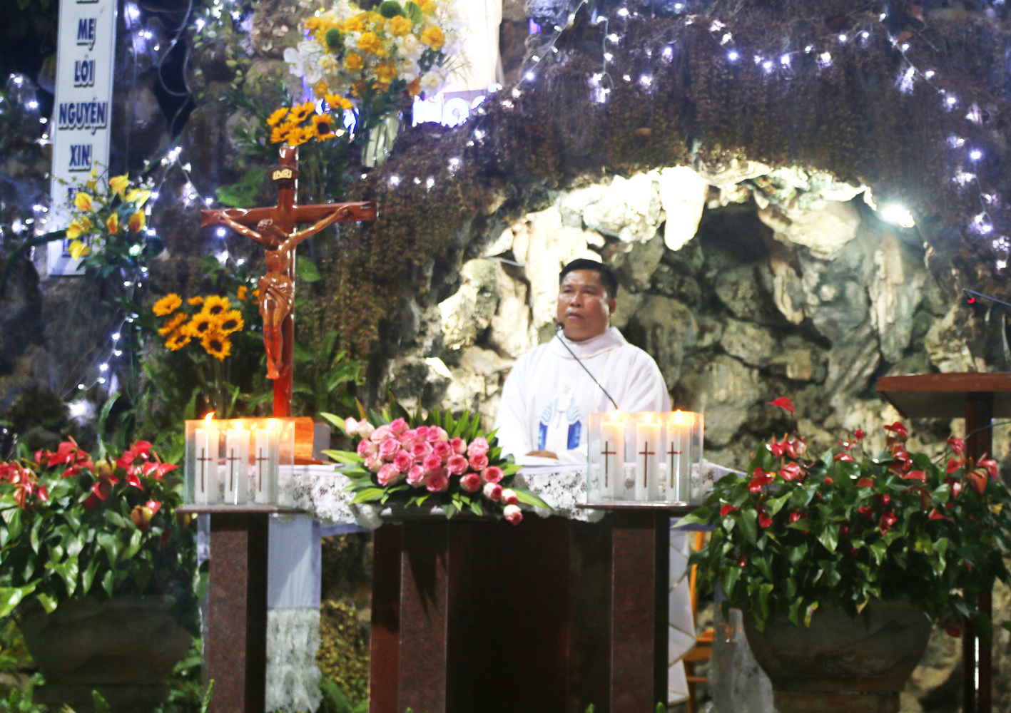 Sau bài Tin Mừng (Lc 1, 26–38), Cha Quản xứ chia sẻ cùng cộng đoàn: Mẹ đã luôn sống tâm tình vâng phục, khiêm nhường và tín thác vào thánh ý Thiên Chúa. Khi Mẹ thưa “xin vâng”, chính là lúc Mẹ vượt qua chính mình, vượt qua dư luận, vượt qua tất cả để đón nhận thánh ý của Thiên Chúa. Mẹ đã vượt qua nỗi sợ hãi và sự hoài nghi để tin tưởng tuyệt đối vào quyền năng của Thiên Chúa.