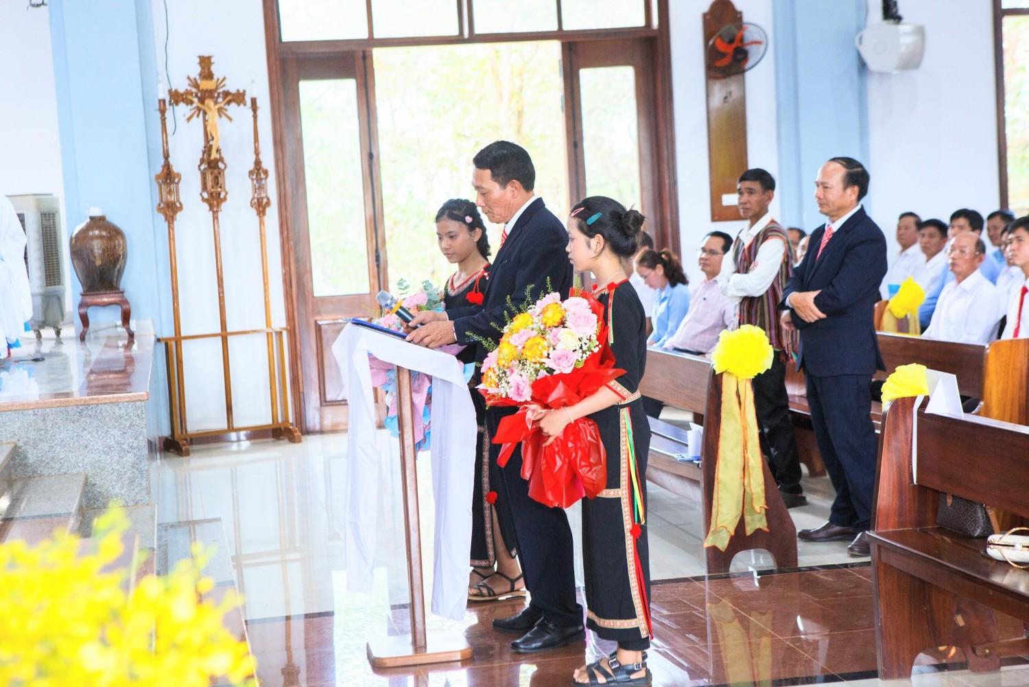 Sau phần hiệp lễ, vị đại diện cộng đoàn đã dâng lời tri ân lên Đức Cha, quý Cha, quý Tu sĩ và toàn thể cộng đoàn đã hiện diện, cầu nguyện và chia sẻ niềm vui với Giáo xứ Thiên Ân trong ngày đặc biệt này. Hai bó hoa tươi thắm đã được dâng tặng lên Đức Cha và Cha Tân Quản xứ.