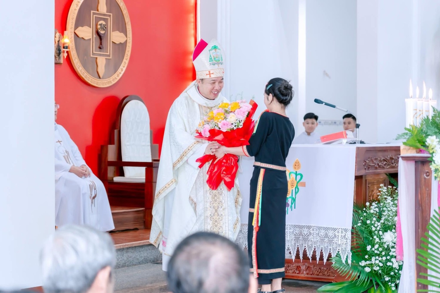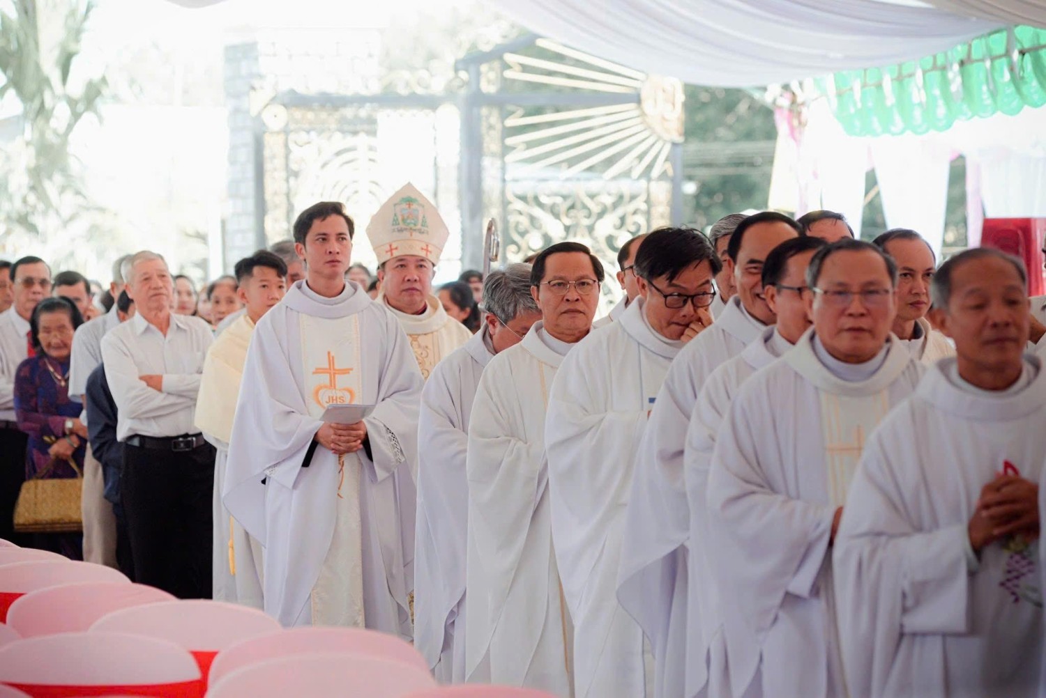 Ngay từ sớm, bà con giáo dân cùng quý khách xa gần đã quy tụ về khuôn viên Nhà thờ trong bầu khí rộn ràng và hân hoan, để đón tiếp Đức Cha, quý Cha, quý Tu sĩ nam nữ và quý khách mời.