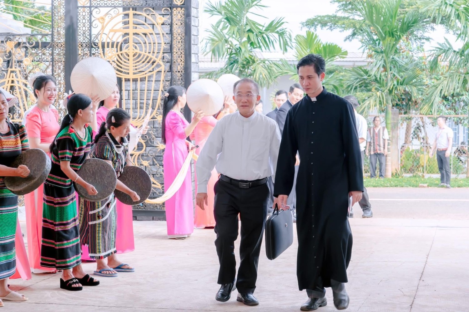 09g00 - Đoàn rước Đức Cha, quý Cha đồng tế hân hoan hoan tiến vào Thánh đường trong tiếng cồng chiêng, hoà quyện cùng tiếng  hát của ca đoàn, mở đầu cho giây phút thiêng liêng mà cộng đoàn dân Chúa Giáo xứ Thiên Ân đã từng ngày mong đợi.