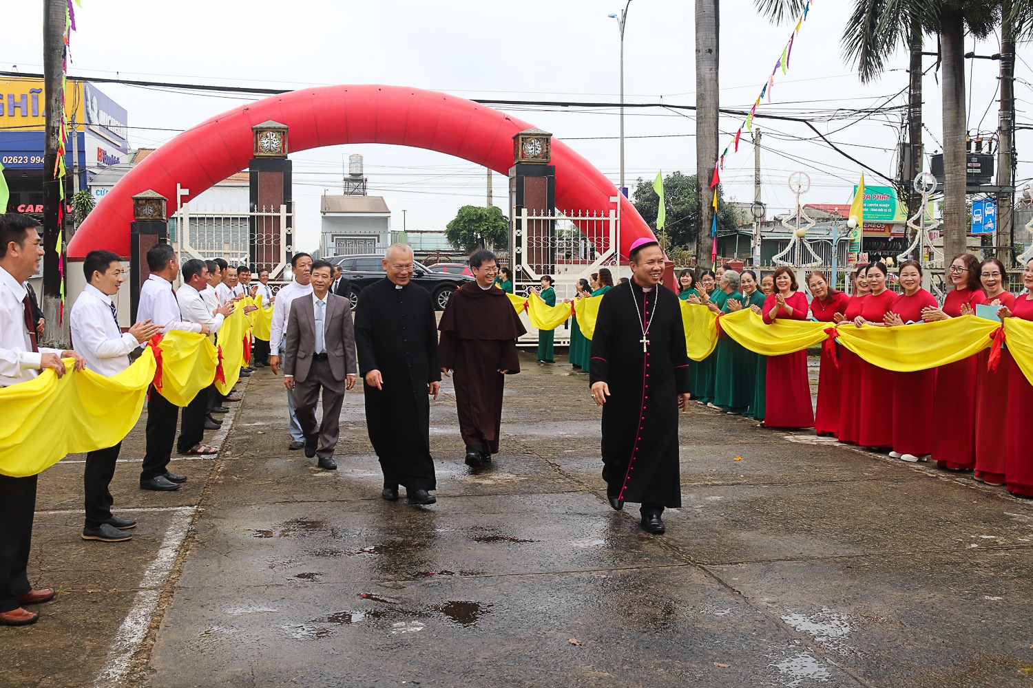 Tiếp đón Đức Cha tại cổng nhà thờ, có Cha quản xứ GB. Phạm Thế Truyền, Cha phó xứ Giuse Phạm Văn Thưởng và Cha phụ tá FX. Nguyễn Văn Khoa (O.Carm). Hai hàng chào danh dự của Hiền mẫu và Phụ Huynh đứng hai bên dàn chào mừng đón vị Cha Chung cùng toàn thể đông đảo tín hữu.