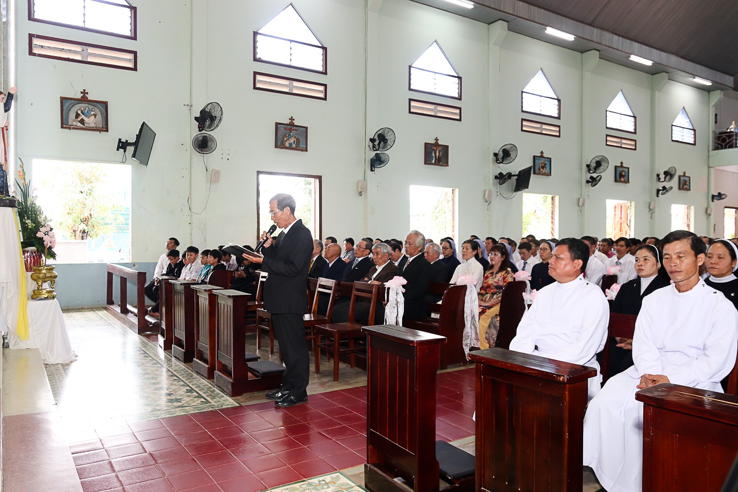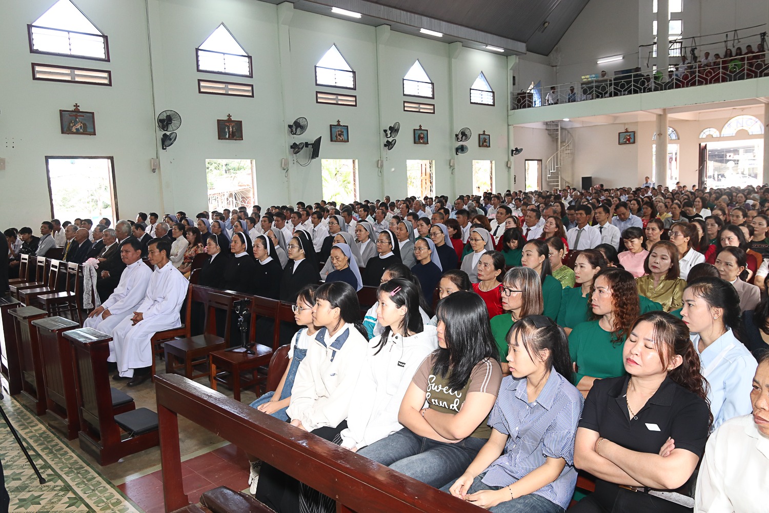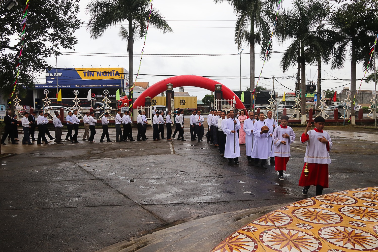 Đoàn rước bắt đầu lúc 9g30. Đức Cha GB. chủ tế Thánh lễ đồng tế với 30 linh mục trong và ngoài Giáo phận. Hiện diện trong Thánh lễ có Cha Phêrô Đỗ Minh Hiển,  Quản hạt Mẫu Tâm, Cha Giám tỉnh Dòng O.Carm, quý Cha đã từng phục vụ tại Duy Hòa qua các thời kỳ, cùng quý Cha là những người con của Giáo xứ đang phục vụ ở nhiều miền đất nước. Thánh lễ còn quy tụ đông đảo quý tu sĩ nam nữ và đại diện các thành phần Dân Chúa hiệp thông trong bầu khí trang nghiêm, sốt sắng.